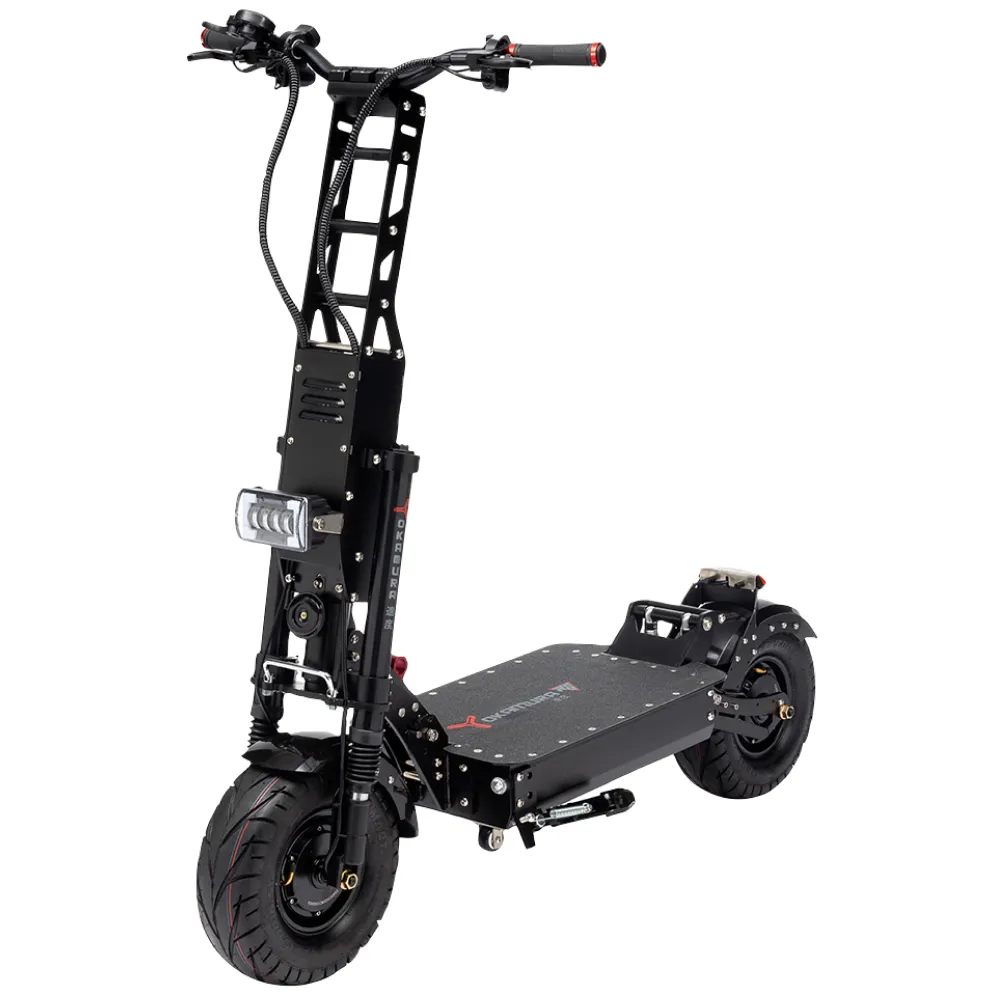 YOKAMURA RS не уступает и по техническим данным. Мощность двух его мотор-колес составляет 6000 Вт. Электросамокат развивает скорость 80 км/ч, для такого агрегата производители предусмотрели отличную тормозную систему, которая состоит из гидравлических и дисковых тормозов. Питание двигателей от аккумулятора емкостью 45 А*ч, зарядить его можно за 10 часов. Одного заряда достаточно для 85 км пути.