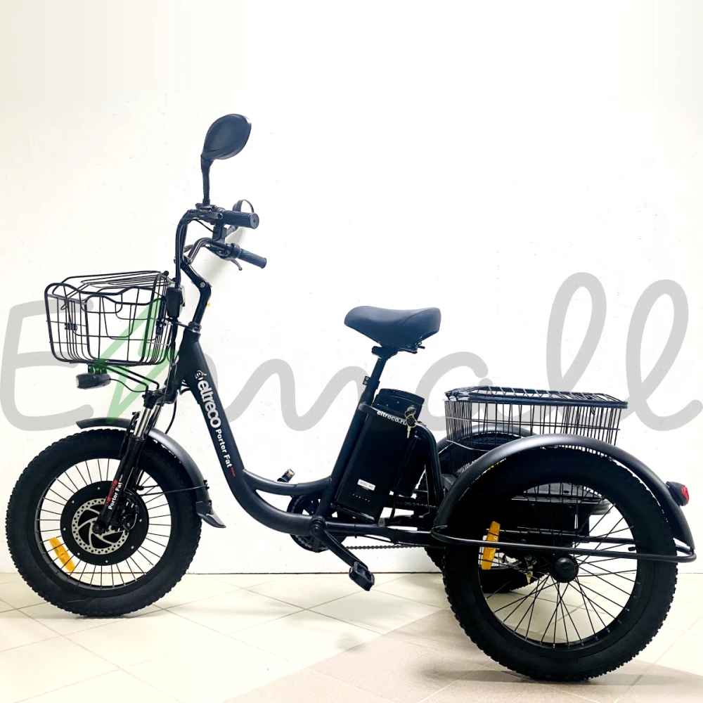 ТРИЦИКЛ ELTRECO PORTER FAT 500 имеет устойчивые колеса диаметром 20 дюймов, достигает скорости в 35 км/час, выдерживает нагрузку в 110 кг.