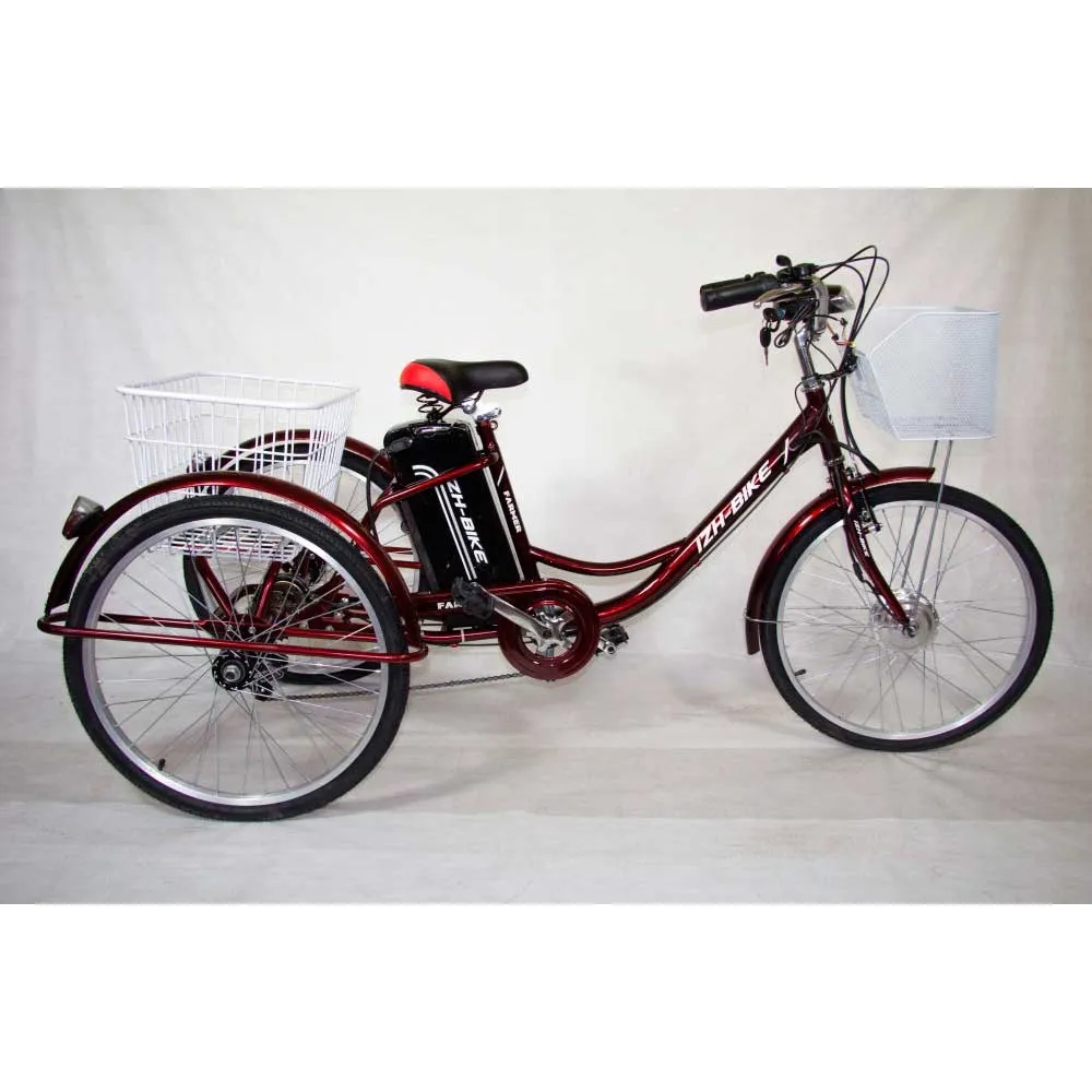 Электрический трицикл для взрослых Farmer создан для комфортных поездок по сельской и городской местности. Надежный помощник для любителей садоводства и дачников, обладает максимальной устойчивостью и оснащен двумя корзинами для перевозки вещей. Высокая грузоподъемность (до 130 кг), высокопрочный стальной корпус, двигатель на переднем приводе, 6 скоростей — модель Farmer гарантирует практичность и надежность использования. Большие колеса легко преодолевают препятствия на дороге, делая электровелосипед Farmer идеальным компаньоном в поездках по загородным грунтовым дорогам. Гелевая батарея мощностью 250 Ватт обеспечивает запас хода велосипеда 45 км, модель развивает скорость до 26 км/ч и поддерживает ее на протяжении всего пути. Экономичное и экологичное решение для современных дорог.
