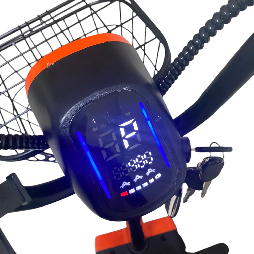 • Отличия от классических эл‑самокатов: полноценная рама, два сиденья, корзина, спинки и зеркала – это как гибрид городского электровелосипеда и компактного электроскутера.